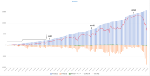 今週も豪ドル/NZドルの上昇し、確定益(青)は増加しましたが、損切りしたため目減りしています。含み損(オレンジ)は爆増で、差し引きの利益(赤線)がナイアガラとなっています。