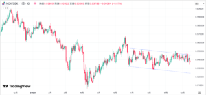 緩やかな下落トレンドが続いていて、上限を超えたと思うと戻されて値幅が出ていません。今週に入ってやや下げています。
