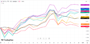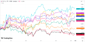対円の週間騰落の上位は、南アフリカランド、ハンガリーフォリント、ブラジルレアルでした。一方で、トルコリラと米ドルが週間マイナスで下位となりました。