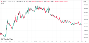 米ドル/メキシコペソの売りを100,000通貨保有としていましたが、トランプ関税相場に耐えられず半分に減らしています。