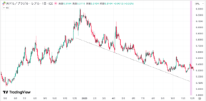 レアル/円は前の週につけた29.616の年初来高値からはやや下げていますが、日銀利上げ見込みが強まっている割に値を保っています。