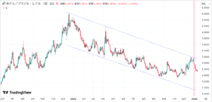 ドル/レアルは下落トレンドの上限まで上昇したところで止まり、反転下落となっています。