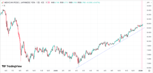 1月4日週のメキシコペソ/円は8.724で始まり8.693まで下げましたが、8.795まで上昇し8.784でクローズとなりました。