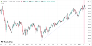 2月1日週のレアル/円は、週初に29.468で始まり29.149まで下げますが、30.139まで上昇して30.138で週末クローズとなっています。8日週は円高となって29.286まで下げています。