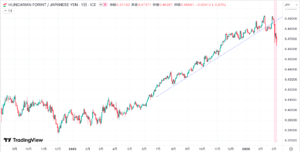 フォリント/円は前の週の利下げでも昨年からの上昇トレンドの支持線(青)を回復して順調に見えましたが、米・イスラエルによるイラン攻撃で急落となりました。他のクロス円の通貨と比較して大きな下げとなっていて、フォリント一人負け状態となっています。
