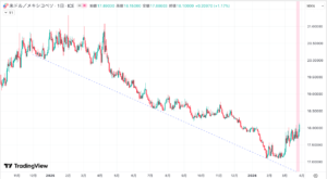 中東紛争による振れもやや収まって、ドル/ペソの動きも落ち着いてきたかと思ったのですが、利下げでマイナスとなりました。